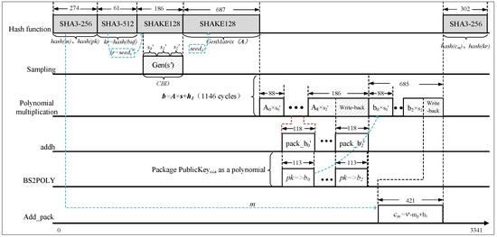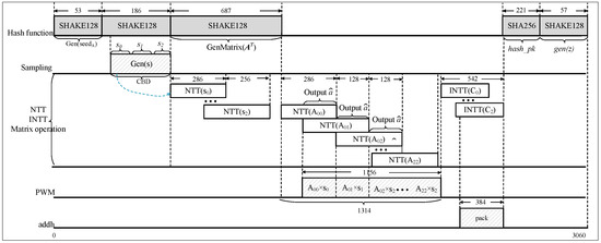 Additionally, the paper selects the pipelined NTT transformation structure for a better balance between speed and area. The radix-2 Multi-path Delay Commutator (MDC) NTT structure, as designed in the referenced work [18], is considered a classic approach. The architecture has no complex memory control logic and fully utilizes spare cycles in each stage, achieving high throughput. The radix-2 MDC pipelined NTT structure is employed for the Saber algorithm in this paper. The implementation and improvement of the overall NTT multiplier is illustrated in Figure 11. Based on a single MDC-NTT/INTT core, two modular multiplication units are externally added for point-wise multiplication. These modular multiplication units are similar to those in the NTT core, reducing the 45-bit value to 23-bit through modular reduction. The loading module for the public polynomial coefficients remains unchanged from the previous description. This module enables the continuous reading of 13-bit or 16-bit coefficient data streams during the forward NTT process. The “” signal selects the target of the NTT transformation. After performing NTT on one polynomial operand, the two sets of coefficients are merged and stored at the same address in the BRAM. During the NTT forward transformation of another polynomial operand, the coefficients corresponding to the previous storage in the BRAM at the respective order are read, point-wise multiplied, and accumulated when the data output starts per cycle. The input to the INTT is the result of three polynomial multiplications, followed by point-wise multiplication. The resulting polynomial is then reduced modulo the modulus or of the Saber algorithm. Finally, the sequence of results is reversed, bit by bit. The protocol circuit based on the NTT multiplier is similar to Figure 3, but with the inclusion of two 36K-bit BRAM blocks to store the data after NTT transformation and point-wise multiplication. The state machine of the entire circuit is configured to achieve module parallelism. Similarly, the timing sequence diagrams for key generation and key encapsulation are shown in Figure 12 and Figure 13, respectively. The key generation phase requires 3060 cycles, the key encapsulation phase requires 4961 cycles, and the key decapsulation phase requires 5910 cycles.