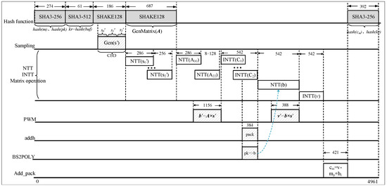 The timing arrangement for the key decapsulation process is similar to the two diagrams, requiring a total of 4005 cycles. The key decapsulation phase consumes the most cycles due to the additional operation of public key encryption. It can be observed from the timing diagrams that parallelizing the modules and minimizing idle cycles within the functional submodules significantly reduce the overall protocol execution time, thereby increasing the circuit’s throughput rate.