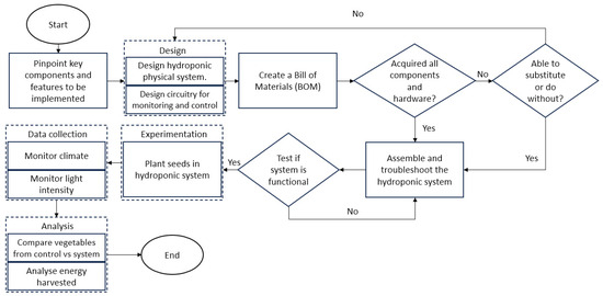 Like all living things, plants require water to thrive and grow. Water is essential for plants and requires proper and balanced water flow for optimal plant growth. Too much water can cause root rot and reduce oxygen levels in plant roots, while too little water can cause wilting, stunted growth and even plant death [1]. For millenniums, humankind has been making use of water irrigation for agricultural systems to increase crop production [2]. Irrigation is a crucial component of modern agricultural practices, playing a pivotal role in shaping the productivity and sustainability of farming systems worldwide [3,4,5]. Types of irrigation in agriculture include drip irrigation, sprinkler irrigation, surface irrigation, subsurface irrigation, micro-sprinkler irrigation, lateral move irrigation, and center pivot irrigation [6]. IoT (Internet of Things) technology has revolutionized irrigation by enabling the integration of sensors, automation, and data analytics, allowing farmers to monitor and control irrigation systems remotely for precise and efficient water management [7,8]. Due to the scarcity of land and the need for sustainable food production, the soil-free method that relies on irrigation to grow plants known as hydroponics has become quite popular in Singapore’s urban farming community [9]. Urban agricultural methods in Singapore have recently undergone significant innovation thanks to IoT and hydroponics. Sensors, automation, and data analytics are used in IoT-enabled hydroponics systems to increase resource management, crop growth, and overall effectiveness [10,11]. Sensors are used in IoT-enabled hydroponics systems to keep track of elements including temperature, humidity, pH levels, fertilizer levels, and water quality. These sensors gather data, transfer it to a centralized system, and then analyze it to produce insightful information. Through mobile or online applications, farmers may remotely access these data, enabling them to make educated decisions and change the growing environment as necessary [6,12]. The integration of hydroponics and IoT greatly benefits Singapore. It makes it possible to manage environmental factors precisely and dynamically, guaranteeing the best possible circumstances for plant development. Based on real-time data, automated systems may modify variables like water flow, fertilizer dosing, and lighting to optimize resource use and increase crop yields. IoT technology also makes it possible to identify abnormalities or departures from ideal circumstances early on, allowing for prompt crop loss prevention measures [13]. Singapore wants to produce at least 30% of its food domestically by 2030 [14]. This means that local farms have started adapting the above-mentioned urban farming techniques.
