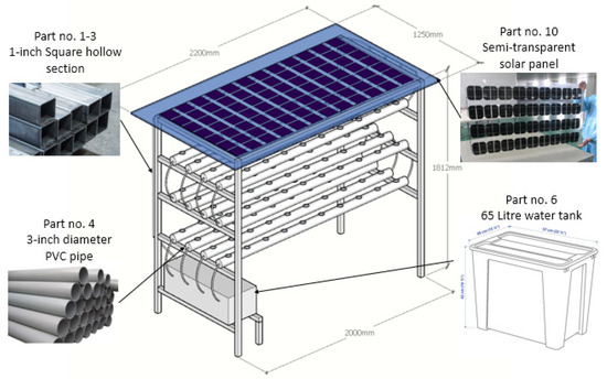 The prototype is made up of the main structure and the circuitry. The main structure consists of the frame, water tank, grow tubes and plumbing. The frame, which is made of square mild steel hollow tubing (1 inch) is either welded or bolted at the connections. The water tank used is an off-the-shelf plastic box that has a capacity of 65 L. Grow tubes that are used to transport water and hold the plants are made using 3-inch diameter PVC pipes and pipe fitting caps. Plumbing consists of 10 mm flexible PVC hose and connectors.