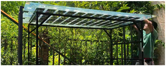 Figure 9 shows a modified scissor jack that sat atop the hoisting rig, which allowed the heavy glass panel to be lifted easily and safely bit by bit until the main frame could be placed under it. The transparent solar panel was then lowered and attached to the main frame with heavy duty foam tape adhesive to prevent any slipping of the glass. This can be seen in Figure 10.