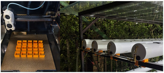 Figure 12 shows the water inlet and 3D printed mounting. The grow tubes are seated atop clips that were 3D printed to prevent rolling and allowed the adjustment and fine tuning of the heights of the tubes. This proved to be effective in adjusting the individual hydraulic heads of the inlets, which in turn allowed the control of flow into each of the 4 separate tubes. With this, the 4 tubes were set up to have even flow, and all 4 filled up approximately at the same time.