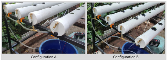 The initial outlet configuration of the irrigation system that leads back to the water tank was made to be the same as the inlet. As the pump ran continuously, a problem arose. Water would not be exiting the outlet, resulting in an overflow out of the holes where the plants are meant to be seated. Initially, this was thought to be friction caused in the tubes resulting in low output flow. The output irrigation configuration was then changed from configuration A to configuration B, as shown in Figure 14, which reduced overflowing. However, from time to time, it would still overflow.