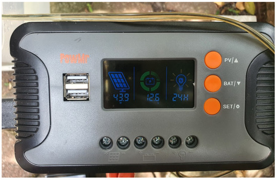 Figure 17 shows the charge controller with the solar wattage and battery voltage. For an initial test, the solar panel, charge controller, and battery were connected. On a cloudy day, the pump was able to run constantly while the battery was being charged at the same time.
