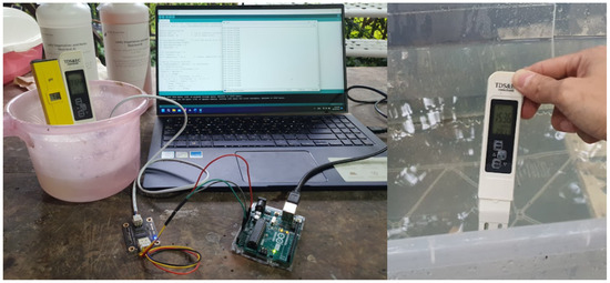 An initial comparison of readings from a TDS/EC reader and water PH reader were matched with the readings of the Arduino Water quality sensor. It was noted that there was a difference of approximately 20%. Further research on how the water conductivity function revealed that the temperature of the water affects readings, and thus, temperature compensation was needed for accurate readings [25]. To solve this issue, a water temperature sensor probe (DS18B20) was added to the system. This provided accurate water temperature readings that were used for temperature compensation in the code. After temperature compensation was added, the water quality readings were calibrated and gave the same readings from the TDS/EC reader and water PH reader, as seen in Figure 18.