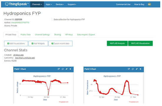 ThingSpeak is an open IOT platform that allows sensor data from the Arduino microcontroller to be collected and stored through the internet. As seen above, data which were sent to the platform every 20 s allowed for real-time monitoring and as well as analysis of the data collected. For even more detailed analysis, the data were exported to Excel for further processing. After the individual components were tested and an understanding of how each component functions was established, they were individually woven together into a smart system using the Arduino UNO WIFI microcontroller and Arduino IDE program.