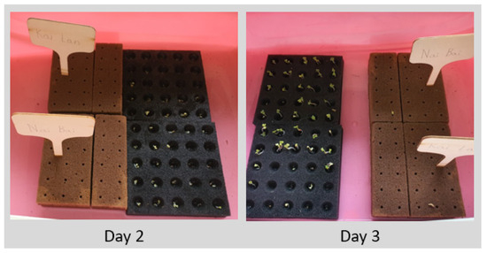 As instructed by Brandon, the seeds were put into the sponge and partially submerged in water for 2–3 days until the seeds started to sprout and roots start growing out the bottom. Figure 22 shows days 2 and 3 of this process.