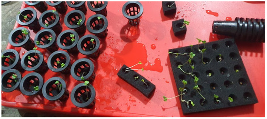 On the fourth day, the roots began growing through the sponge, indicating that it was time for transplanting. The sponge media were then separated into individual blocks and put into the net cups. As seen in Figure 23, the cups were then placed into the hydroponic system.