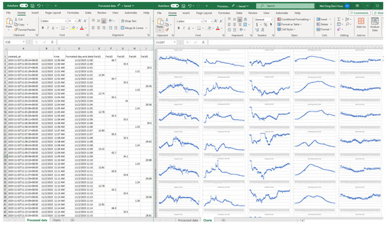 Raw data collected on ThingSpeak were exported in the Microsoft Excel format, where the data were processed. The raw data were used to calculate the daily watt hour of power generated as well as plotting the 5 different fields of data collected in daily charts, as seen in the screen capture in Figure 24.
