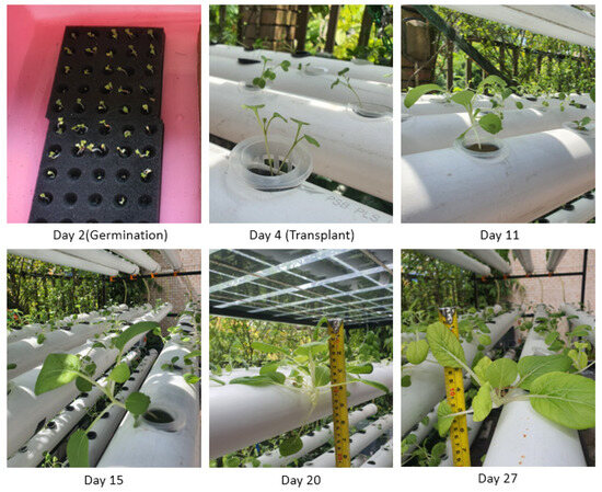 As the two species of vegetables grew, both were assessed visually on how well they were doing. Factors such as leaf color, stem thickness and root mass gave an idea on how the plants were doing. The different stages are shown below in Figure 27.