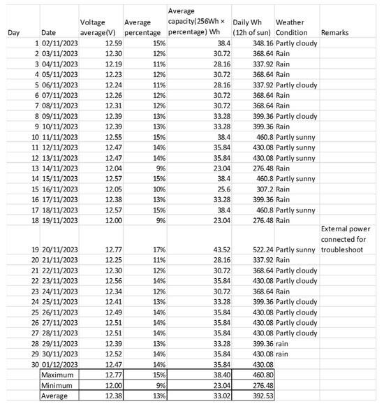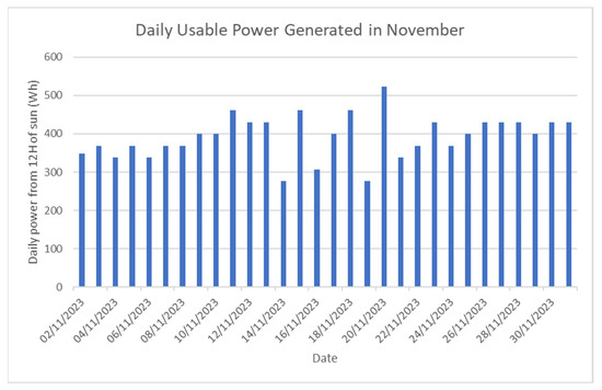 For the 30 days of data collected in the month of November 2023, the daily watt hour of usable power harvested is presented in Scheme 1 below. Usable power harvested refers to the amount of power that ends up in the battery after losses such as passing through the charge controller. From the table below, it was observed that the usable power harvested is often larger than the battery capacity. This means that when the battery is fully charged, excess power is wasted.