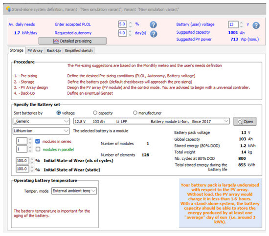 As the battery capacity of 256 Wh was observed to be insufficient, it was important to find out if a secondary battery would increase the performance of the system. This was achieved through simulation software for photovoltaic systems known as PVsyst (Version 2.4). The software gives recommendations and prompts if there is a flaw in the simulated system. Figure 30 shows a prompt that the setup with a single battery is undersized for the PV array that is being used in the prototype.