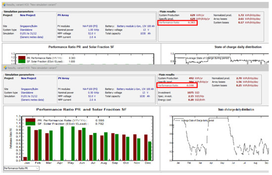 Simulating for one battery alone gave a poor performance ratio of 0.383. With an additional battery simulated into the system, the performance ratio was greatly increased to 0.598, as seen in the screen capture of the two simulations performed in Figure 31.