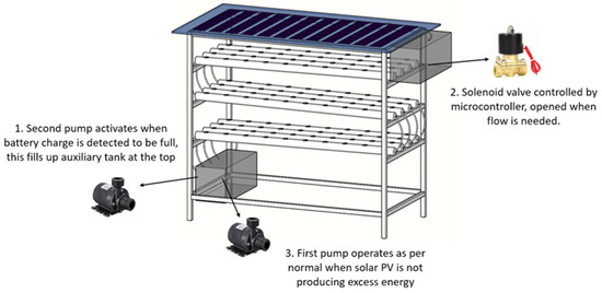 Other than a second battery, other viable forms of energy storage that could have been implemented include pumped storage hydropower. A secondary water tank and pump could have been implemented into the prototype. Here, when the battery is at full charge and the solar PV is still producing electricity, water could be pumped into the auxiliary tank at the high elevation for storage. This means that to create flow, the system will only have to need a low-powered solenoid valve to be opened, and gravity will do the work, saving the need for more stored energy in the form of a battery. A simple mock-up of the concept is shown in Figure 32.