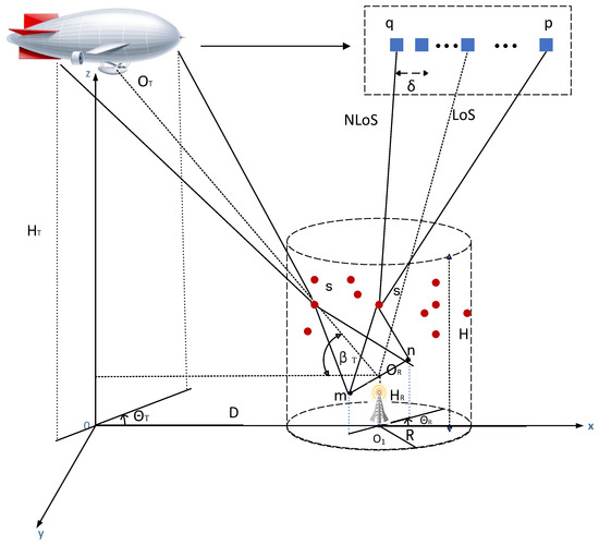 Typically, geometric modeling methods based on ellipsoids, hemispheres, and cylinders are used [33,34,35]. However, the ellipsoid model is only suitable for situations where the receiver is higher than the scatterers. The channel model based on hemispheres usually assumes that the elevation and azimuth angles of the propagation path are correlated. These models can only be applied to specific scenarios and are not perfectly applicable to HAP environments. Nevertheless, the model based on cylinders can adapt to open channel environments and is particularly suitable for situations with high transmitting ends. Therefore, we choose the cylinder model for the HAP channel.