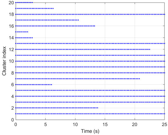 We use scenario movement to describe the correlation between two clusters. When the value is high, the correlation between the properties of the existing clusters at t and the newly generated clusters at decreases. Figure 2 shows the image of the multipath components (MPCs) of the birth–death process, which assumes = 0.13/m and = 0.03/m.