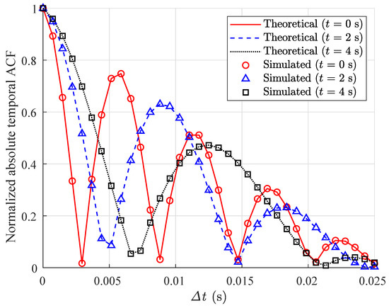 Due to the mutual movement between SBS and TMS, the channel model exhibits non-stationary characteristics in the time domain. Figure 5 shows the variation of time-domain normalized ACF with time interval at three different starting times t = 0 s, t = 2 s, and t = 4 s. As shown in the figure, the temporal ACF for different simulation starting times has significant differences. The theoretical results and simulation results are basically consistent. Therefore, the proposed model can characterize the non-stationary characteristics in the time domain.