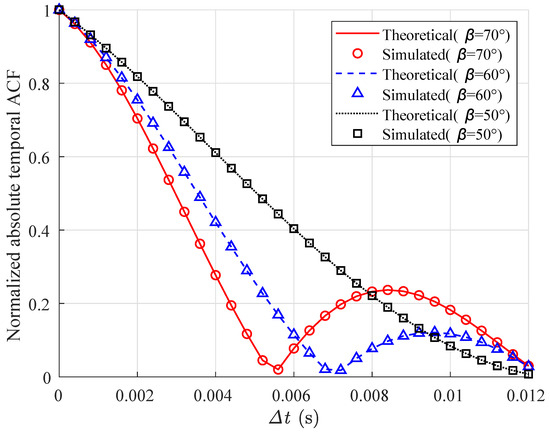Figure 6 depicts the variation of the temporal ACF with different elevation angles at t = 0 s; as shown in the figure, the increase in leads to a sharp decrease in temporal correlation. In the HAP system, when the elevation angle changes, the length and propagation time of the signal propagation path also change accordingly. This results in different multipath signals reaching the TMS at different phases, thereby affecting the temporal ACF of the signal. As the elevation angle increases, the signal propagation environment changes more dramatically, the diversity of signal propagation paths increases, and multipath effects become more significant. Therefore, the impact of HAP motion on time correlation is decreasing.