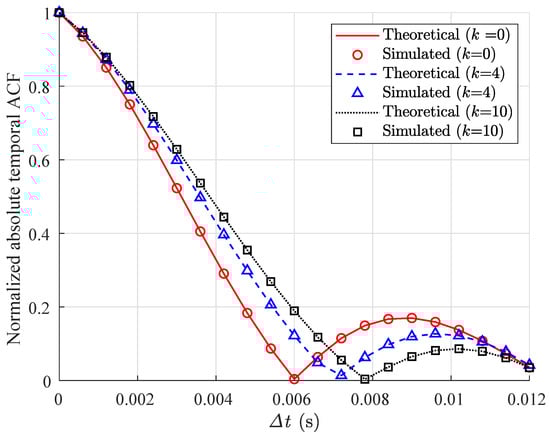 Figure 7 shows the temporal ACF between the isotropic environment k = 0 and the non-isotropic environment k = 4 and k = 10. It can be seen that, as k increases, the distribution of scatterers becomes more concentrated and the correlation becomes higher.