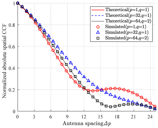 Due to the drastic changes in the channel caused by the near-field effect with the antenna array, the massive MIMO channel we use exhibits non-stationary characteristics in the space domain. We calculate the changes in the space domain normalized cross-correlation function with the array element spacing for three sets of transmitting and receiving antenna pairs p = 1, q = 1, p = 32, q = 1, and p = 64, q = 2, respectively. Figure 8 shows that the spatial CCF of different receiving and transmitting antenna pairs is significantly different. This is because different antennas have different positions and directions in space. Due to the different positions and directions of different antennas, the propagation paths experienced by the signals they receive will also vary. This results in signals between different antennas having different delays and phase differences, leading to changes in spatial CCF. The theoretical and simulation results are in good agreement. Therefore, the proposed channel model can describe the non-stationary nature of channels in the space domain.
