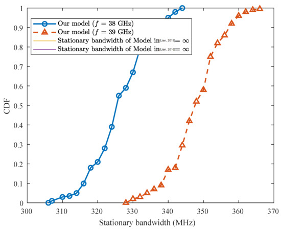 The cumulative distribution functions (CDF) of the stationary bandwidth of our channel model at different frequencies and the model in [31] and the model in [32] are shown in Figure 10. The threshold is chosen as 0.9. The model in [31] and the model in [32] did not consider FCF, and the stationary bandwidth is infinite. The channel whose bandwidth less than the stationary interval can be considered as frequency stationary. Therefore, in the case of wide bandwidth at the mmWave band, it is necessary to consider the non-stationary characteristics of the frequency.