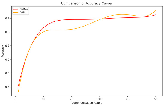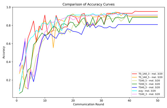 The experimental results in Figure 6 indicate that with a temperature of 0.1 and a weight of 0.3, the proposed algorithm in this paper outperforms the Federated Average (FedAvg) algorithm. This is mainly because the experiment used a lower temperature to prevent overfitting the model to the training data. At this temperature, the model focuses more on details and enhances its generalization ability, which is then aggregated into the global model. This federated learning approach based on distillation defense boosts the model’s confidence, favoring high-confidence predictions. These highly confident predictions, when merged, ensure the final predictions of the model are more reliable and accurate. Hence, under these temperature and weight conditions, the experiment yields better results. However, it is important to note that the chosen parameters in this study are a balance between convergence speed and process. As seen in the graph, due to considerations of compromised clients during convergence, the proposed model as a whole requires multiple rounds of training to reach convergence. Therefore, fluctuations occur during convergence due to the randomness in role assignments and uncertainty regarding the allocation of roles to malicious clients. Nonetheless, these fluctuations tend to diminish as the training progresses steadily because the system identifies and screens out malicious clients involved in the training process, as proposed in this study.