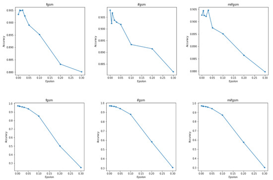 Next, this paper assesses the robustness of the defense models proposed in this study through three types of attack experiments. The experiments employ the FGSM, IFGSM, and MI-FGSM attack methods. The FGSM (Fast Gradient Sign Method) introduces perturbations to input data based on the gradient information of the model, maximizing the loss function to cause erroneous outputs from the model. The IFGSM (Iterative Fast Gradient Sign Method) generates adversarial samples through iterative adjustments applied to input data using the model’s gradient information across multiple iterations, thereby increasing the model’s error rate. The MI-FGSM (Momentum Iterative Fast Gradient Sign Method) is an advancement of the IFGSM that introduces a momentum term, enhancing the exploration of the adversarial space during iterations and making the attack more potent.