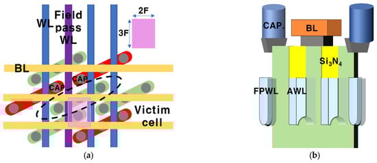 (a) DRAM array diagram. Diagram of 6F2 DRAM array top view and relative position of field pass gate and victim cells. (b) DRAM 3D BCAT structure: 3D BCAT structure cross view used for transistor simulation. This structure shows a view of the black dash circle region.