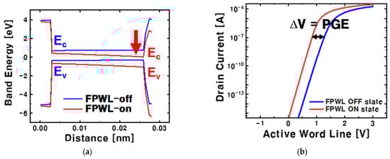 (a) AWL and FPWL band energy graph. The simulation results of 2D BCAT structure: band diagram along the red dashed cut lines in Figure 2. (b) IdVg characteristic graph of DRAM. The simulation results of 2D BCAT structure: IdVg curve. We defined the voltage difference at the point of 10−7 current as PGE.