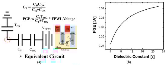 Prior to this study, to comprehend the substantial influence of PGE on DRAM structures, we conducted an analysis of PGE through alterations in the dielectric constant of STI. The simulation was conducted by applying materials currently used as oxides or available as oxides as STI. As the dielectric constant of STI increases, PGE exhibits a corresponding increase (Figure 4). Figure 4 reveals a noteworthy pattern: a decrease in PGE corresponds to a reduction in the dielectric constant within the region flanked by AWL and FPWL. This reduction aims to mitigate the interference caused by FPWL’s electric field on the AWL channel. Our experiment confirmed this hypothesis, corroborated by comparing it with changes in PGE as influenced by varying dielectric constants calculated from the summed ideal capacitance between AWL and FPWL. To calculate the ideal capacitance, replace the silicon and oxide present between AWL and FPWL with capacitors and then connect them in series to represent an equivalent circuit. In Figure 5a, the region between AWL and FPWL transforms into an equivalent circuit, represented by capacitances Tox, Csi, and Cox. Notably, PGE escalates with the stronger impact of FPWL’s voltage-induced electric field, within the Tox and CT regions. Our calculations of ideal PGE, while manipulating Cox’s dielectric constant, depicted in Figure 5b, further affirm this observation; a rise in Cox’s dielectric constant directly corresponds to increased PGE. This mirrors the trend observed in Figure 4, validating our simulation data and analysis reliability. Consequently, our study proposes a novel structural design aimed at mitigating interference stemming from traditional DRAM configurations, thereby reducing WLs’ interference and presenting an optimized structural approach.