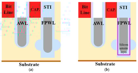 Our proposed structure involves both a partially enlarged spherical STI and a spherical STI with an additional Si3N4 layer. Figure 6a,b show 2D cross-sections of the spherical STI structure and the one with an added Si3N4 layer in the spherical STI, respectively. The spherical STI process can be fabricated through the dry–wet–dry etch process [15]. The spherical STI structure selectively enhances the oxide ratio in a specific area between AWL and FPWL. Spherical STI was adopted to increase the ratio of the dielectric constant of relatively low oxides compared to silicon and not to increase the contact resistance between the silicon and capacitor. Moreover, incorporating a Si3N4 layer within the spherical STI serves to alleviate PGE by enabling charge programming within the Si3N4 layer.