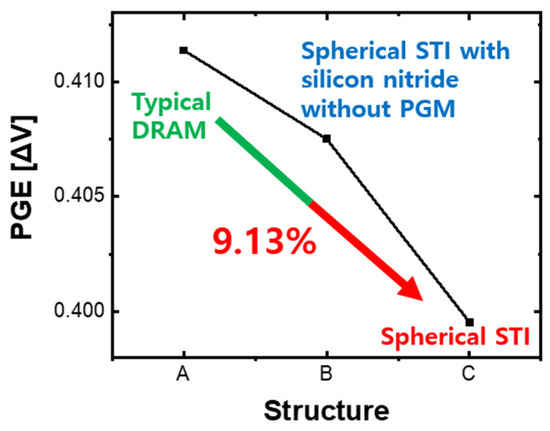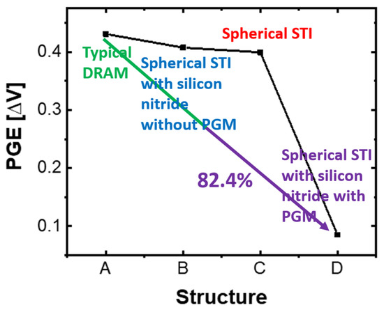 Figure 10 shows a comparison of PGE after programming the PGE and spherical STI with Si3N4 structures of typical DRAM. As a result of the comparison, it was shown that the PGE of the structure optimized through PGM decreased by 82.4% in the spherical STI with the Si3N4 structure finally proposed through our research results rather than the PGE of typical DRAM. As a result, we verified that the research results were consistent with the purpose of the study.