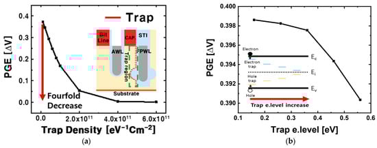 We measured the PGE according to the interface trap density of the surface STI further from the spherical STI structure we proposed. The interface trap of the spherical STI affected the Vth of the victim cell, even when the FPWL was turned off. Therefore, in order to observe the effect of PGE according to the interface trap density, we excluded the Vth change due to the surface trap by adjusting the silicon doping concentration of the DRAM cell. Both the general spherical STI and the spherical STI structure to which the surface trap was applied had the same Vth when the FPWL was turned off. We could purely measure the effect of PGE according to the surface trap density under this condition. Figure 8a shows the PGE change according to the trap density. Interestingly, PGE tends to decrease as the trap density increases. We interpreted this phenomenon from the perspective of an energy band. The energy band figure between AWL and FPWL is shown in Figure 3a. At this time, silicon between AWL and FPWL is doped in a p-type, so the Fermi level energy will be formed close to the valance band. Since the p-type concentration of silicon is not very high, there is a distance between the valence band and the Fermi level energy. At this time, if there is an interface trap between the valance band and the Fermi level energy, electrons are captured and present in this interface trap. The condition in which electrons can be captured in the interface trap is possible when the voltage in the off state of the FPWL we tested is higher than the flat band voltage. We found the flat band voltage condition while changing the voltage of the FPWL. As a result, it was confirmed that the flat band condition appears at a voltage relatively lower than the voltage in the FPWL off state in which we experimented. Therefore, even when the FPWL we experimented with is off, electrons can be captured in the interface trap. The negative charge captured in this interface trap causes capacitance coupling between the AWL and the FPWL. As the negative charge increases on the spherical STI surface, the positive charge should increase on the AWL side. The positive charges increased on the AWL side appear as if a positive voltage is applied to the AWL. As a result, the Vth of the victim cell decreases even in the FPWL off state. This brings about the effect of reducing the Vth difference between the FPWL off state and the on state and, finally, shows the effect of improving the PGE. This effect improves the PGE by effectively reducing the Vth difference as the interface trap density increases. Nevertheless, even if the interface trap density increases, there is a section in which the PGE hardly decreases. Electrons sufficiently captured in the interface trap of the spherical STI reduced the voltage interference between FPWL and AWL extremely. Therefore, the trap fish on the spherical STI surface is an important variable affecting PGE.