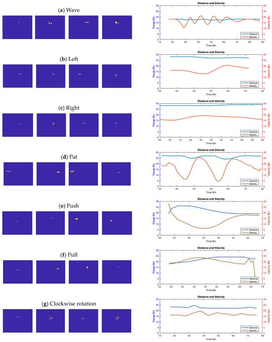 The dynamic movements are recorded and analyzed to identify specific features such as the range, the velocity, and the angle. The palm is the region of motion, and its coordinates are determined using the strongest signal in each frame. Figure 4 illustrates the pattern of palm movement throughout time. It characterizes each gesture in the RDM. During the push (PS) action, the target moves upwards toward the top of the RDM, whereas during the pull (PL) action, it travels away from the RDM. On the right side of Figure 4, how distance and velocity vary with time is depicted. These variations prominently reveal the motion patterns to be recognized. For instance, when performing a wave (W) motion, there is a periodic variation in speed; when executing a pat (P) gesture, there is a periodic change in distance and velocity. In addition, ‘push’ and ‘pull’ exhibit distinctive distance and velocity variation characteristics. However, additional factors like the angle should also be considered to distinguish other motions.