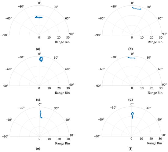 The range-angle in polar plot with different gestures. (a) Wave; (b) left; (c) right; (d) pat; (e) push; (f) pull; (g) clockwise; (h) anti-clockwise.