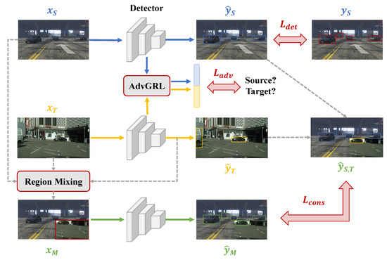 The training algorithm of AdvMix can be concluded as three steps. First, the detection network is initialized with COCO [46] pretrained parameters and other modules are randomly initialized. The second step is the forward propagation, where the paired source and target images are fed into the network and the total loss is calculated according to Equation (3). Finally, all parameters of the network are updated in the back propagation. It is notable that the proposed AdvGRL and region mixing module only works in the training process and we just employ the detection network in the inference.