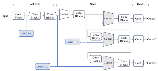 Apart from the structure of AdvGRL, where to insert the AdvGRL is another issue that should be considered. As shown in Figure 4, one-stage detector YOLOv5 [33] is composed of three main blocks, including a backbone for feature extraction, a neck for multi-scale feature fusion and a head to generate detection predictions. Furthermore, the bounding boxes with three scales are predicted separately to prevent missed detections. Following the design of YOLOv5, we add three AdvGRLs in the neck of the base detection network, as presented in Figure 4. As a result, the style gap between source and target domain can be diminished from the different levels.