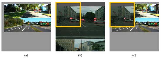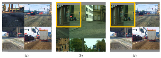 Apart from the style gap, the instance differences (such as distinct object sizes, densities, and distributions) between two domains causes the content gap in the cross-camera and synthetic-to-real adaption tasks. AdvMix solves this problem by introducing the region mixing strategy, where a target region with the highest confidence is combined with the source image to form the synthetic image . Figure 10 and Figure 11 show the forming processes of in cross-camera and synthetic-to-real tasks, respectively. Note that all images in Figure 10 and Figure 11 are drawn during training and they are augmented by Mosaic algorithm [49]. As presented in Figure 10b, AdvMix chooses the left-top region instead of the right-top due to the fact that the right-top obtains lower average confidence. This reflects that the selection strategy in AdvMix is effective at filtering false prediction. On the other hand, with reliable pseudo label contains abundant instances from two domains, which is beneficial for content gap alignment.