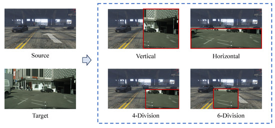 In this subsection, the mixing strategy is varied across four different strategies, including vertical, horizontal, 4-division, and 6-division, as shown in Figure 12. The detection results of these strategies are shown in Table 6 and the baseline method without any mixing strategy is also included. We notice that mixing approaches except for horizontal mix outperform the baseline. It reflects that the cutting direction is a factor to influence the domain adaption. Compared to other mixing options, horizontal cutting contains more background semantic information (such as road) and less objects with high confidence, which impacts the self-training negatively. We also observe that mixing more or less target regions vertically may promote performance to some extent and 4-division is the most suitable strategy with over 5% rise in mAP.