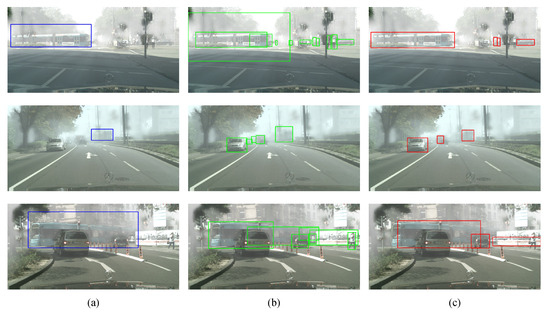 Some examples of false detections. We take the “train” detection on the cross-weather adaption as example. (a) Ground truths (blue rectangular boxes); (b) the baseline predictions (green rectangular boxes); (c) AdvMix predictions (red rectangular boxes).