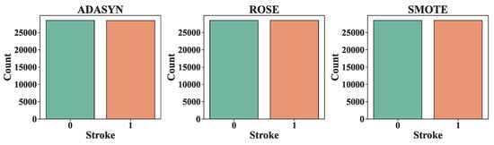 The work uses multiple oversampling strategies to illustrate three ML algorithms for imbalanced data analysis and predicting stroke. Dataset sample sizes generated by SMOTE, ADASYN, and ROSE are all considered and compared to one another to conclude the methods’ relative efficacies. RF, KNN, and LR models were implemented to compare the results of the oversampling dataset. The number of instances was increased proportionally using oversampling techniques, including SMOTE, ADASYN, and ROSE. The distributions of the sample ratios for the oversampling data are summarized in Table 1. Figure 5 displays what changes were performed to the “Yes” and “No” samples in the dataset following the oversampling steps. Then, the dataset is divided into a training set of 80% and a test set of 20%. RandomizedSearchCV was utilized to validate the ability to predict the models.