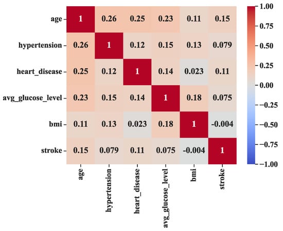 As depicted in Figure 6, the most substantial correlation coefficient is observed between age and hypertension, with a value of 0.26. On the other hand, the weakest significant correlation coefficient is found between BMI and stroke, registering at −0.004. Notably, it is negative but it has statistically insignificant association between BMI and stroke. While the correlation between age and hypertension is of a weakly positive nature, it is still recognized as a valid connection [36]. A correlation coefficient of 0.25 indicates a significant positive association between age and heart disease. Furthermore, Figure 6 also reveals that the lowest significant positive correlation coefficient, at 0.23, is observed between age and average glucose level. As illustrated in Figure 6, each feature exhibits the potential to provide a unique and valuable contribution to the prediction of cerebral strokes.