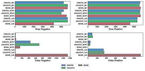 As depicted in the confusion matrix (Figure 7), the test data outcomes were evaluated by applying three ML algorithms, RF, KNN, and LR, to oversampled data. The results indicate a significant impact on prediction accuracy when employing oversampling techniques. Detailed performance analysis, as presented in Figure 7, shows that the prediction model generated using the ADASYN method achieved the highest level of accuracy among the three oversampling approaches.