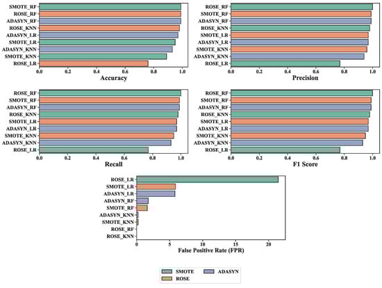 Accuracy, Precision, Recall, F1-score, and False Positive Rate (FPR) of three ML models with three oversampling methods.