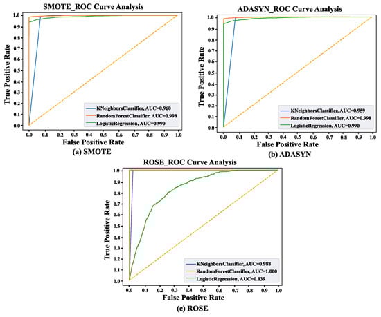 Receiver Operator Characteristic (ROC) curves show model False Positive Rate–True Positive Rate trade-offs. Classifiers perform better when their ROC curves are closer to the graph’s top-left corner. Figure 9 displays ROC curves for classifiers employing three oversampling techniques. The two-dimensional graph shows the False Positive Rate on the x-axis and the True Positive Rate on the y-axis. The ROC curves of the classifiers have shifted closer to the upper left corner of the graph. According to the examination of the ROC curve, after utilizing SMOTE, RF, KNN, and LR have 99%, 96%, and 99% AUC scores, respectively. On the other hand, 99%, 95%, and 99% AUC scores were obtained from RF, KNN, and LR, respectively, after using ADASYN. Lastly, RF, KNN, and LR got 100%, 98%, and 83% AUC scores from SMOTE data.