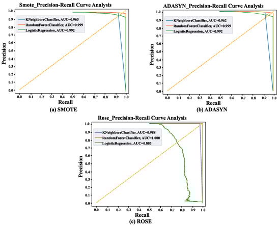 Represents the Precision-Recall curve for the binary classifier, the colors orange, blue, and green representing the ROC curve of class for class-0, and class-1 of KNN, RF, and LR respectively for (a) SMOTE (b) ADASYN, and (c) ROSE.