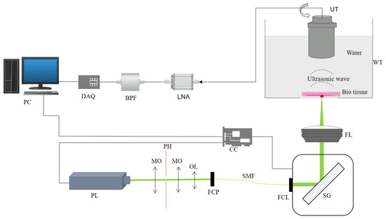 Block diagram of the PAM system; PC, personal computer; DAQ, data-acquisition card; BPF, band-pass filter; LNA, low noise amplifier; UT, ultrasonic transducer; WT, water tank; PL, pulsed laser source; ML, microscope objective; PH, pinhole; OL, optical lens; FCP, fiber coupler; SMF, single-mode fiber; FCL, fiber collimator; SG, scanning galvanometer; FL, field lens; CC, control card.