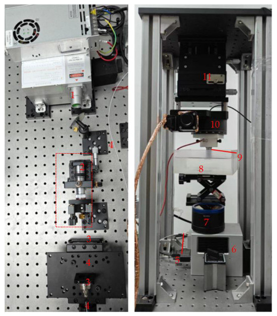 Physical map of the PAM system. 1, PL; 2, spatial filter; 3, FCP; 4, SMF; 5, FCL; 6, SG; 7, FL; 8, WT; 9, UT; 10, rotary table; 11, 3D adjustment mount.