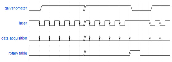 The working sequence of the PAM system is shown in Figure 3. A pulse signal with a frequency of 50 kHz and a duty cycle of 1% is emitted from the control card to control the pulsed laser source and the data-acquisition card to conduct raster scanning and data sampling, respectively, as long as the galvanometer works. The laser source and the data-acquisition card use the same signal sent out from the control card. The laser was designed to be low-level triggered to receive the externally triggered pulses. A triggered pulse corresponds to a laser pulse. The data-acquisition card is in trigger-sampling mode, which would conduct a sampling operation when triggered pulses come. For each triggered pulse, 1024 points are set to be sampled. The rotary table can be controlled by serial communication. Four main commands have been designed to precisely control it to work, namely degrees, speed, direction, and execution. It is important to note that the last command sends no information but serves to initiate the execution of the preceding commands.