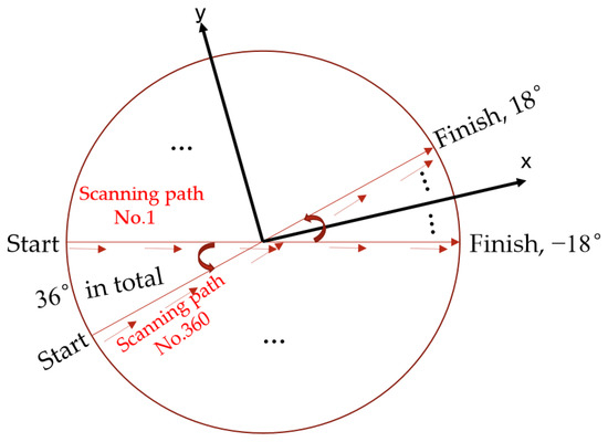 Through the experimental process, we adopted raster scanning of the rotary mode. We got 1000 points from each diameter after maximum projection. Considering imaging speed, we improved the scanning mode, sampling from a diameter-by-diameter approach to a sector-by-sector one, as Figure 4 shows. At first, we scan from to , which contains data of 360 diameters, each scanning diameter is separated by . Then, the transducer rotates for the next raster scanning and sampling, and so forth. For the sector-by-sector approach, the UT keeps still until 360 diameters have been scanned in a sector. In other words, the rotation of the UT and the scan of the 2D galvanometer execute at different times. Repeatedly starting and stopping the rotary table is time-consuming. Therefore, the sector-by-sector approach saves time. Considering the response region of the line-focused UT, the central angle of a sector cannot be too large (36 degrees is appropriate). The transducer needs to rotate to finish the total sampling of five sectors. Therefore, a total of 1024 × 1000 × 360 × 5 points are collected during an imaging process.